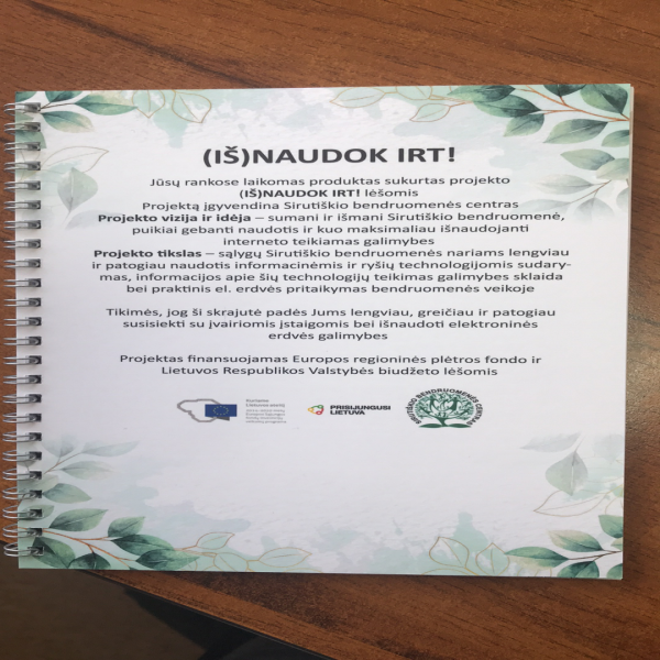 Įgyvendindama projektą, Sirutiškio bendruomenė vykdė daug veiklų – parengė ir socialiniame tinkle „Facebook“ skelbė informacinius pranešimus apie paslaugas, kurias galima gauti elektroninėje erdvėje, vedė praktinius užsiėmimus mažiausiai pažengusiems interneto vartotojams, atliko bendruomenės narių elektroninę apklausą, kuria siekta išsiaiškinti vietos bendruomenės narių poreikius. Tačiau bene svarbiausias nuveiktas darbas – parengtas informacinis leidinys, skirtas Sirutiškio bendruomenės nariams pristatyti informaciją apie elektronines paslaugas šiose srityse: bendruomenė, šeima, sveikata, namai ir saugumas, poilsis ir kultūra, finansai, mokslai ir studijos. Leidinyje pateikiamos nuorodos ir kontaktai įstaigų, su kuriomis dažnai susiduriama asmeniniame gyvenime, vykdant visuomeninę ar verslo veiklą. Sukurti du leidinio variantai – popierinis, orientuotas į vyresnio amžiaus žmones, ir elektroninis, kuris visiems pasiekiamas skaitmeninėje erdvėje. Skaitmeninę leidinio versiją galima rasti internetinėje svetainėje kedainiai.rvb.lt/sirutiskio-bendruomenes-centro-projektas-isnaudok-irt.