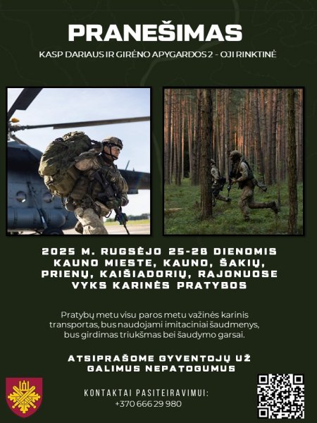 Lietuvos kariuomenės Krašto apsaugos savanorių pajėgų Dariaus ir Girėno apygardos 2-oji rinktinė (toliau – KASP 2 R) 2025 m. rugsėjo 25 – 28 d. organizuoja vertinamąsias lauko taktikos pratybas Kaune, Kauno, Prienų, Šakių, Kaišiadorių rajonuose. Pratybose dalyvaus apie 1000 karių bei atstovai iš miestų savivaldybių, Priešgaisrinės gelbėjimo tarnybos, Policijos, Valstybės sienos apsaugos tarnybos, Lietuvos šaulių sąjungos, Viešojo saugumo tarnybos, Karo komendantūrų valdybos bei Karo policijos.