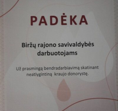 Nacionalinio kraujo centro direktorė Joana Bikulčienė įteikė padėkos raštą Biržų rajono savivaldybės darbuotojams už prasmingą bendradarbiavimą skatinant neatlygintiną kraujo donorystę.