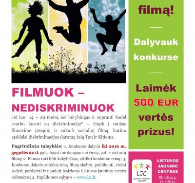 „Filmuok – nediskriminuok“ – tokiu šūkiu Lietuvos jaunimo centras pakvietė jaunus žmones kurti socialinius filmus antidiskriminacijos tema. Konkurso tikslas – paskatinti ne tik atskleisti, kaip diskriminacija paveikia žmones, tačiau ir parodyti išeitis – kaip galime su ja kovoti.