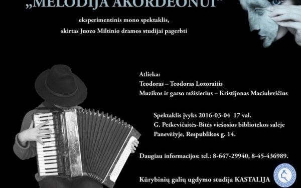 Kovo 4 d. 17 val. G. Petkevičaitės-Bitės bibliotekos konferencijų salėje panevėžiečiams bus pristatytas ekperimentinis monospektaklis „Melodija akordeonui“, skirtas režisieriaus Juozo Miltinio teatro studijai pagerbti.
