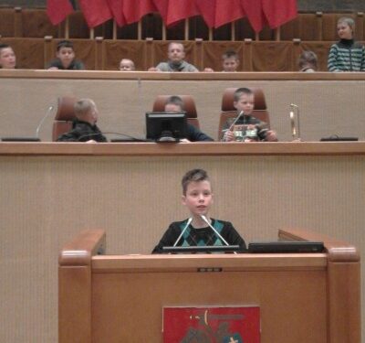 Atvykome keliolika minučių anksčiau nei tikėjomės, bet mus pasitiko besišypsantis Seimo narys Domas Petrulis. Kraštietis  tapo mūsų ekskursijos gidas, kuris aprodė visą Seimą.  Ekskursijos metu, turėjo galimybę susipažinti su Lietuvos valstybės valdymo sistema, parlamento veikla ir institucijos struktūra. Apžiūrėjome atnaujinta  Seimo posėdžių salę. Mums papasakojo, kur sėdi Seimo pirmininkė ir kuriose pusėse – kairiųjų ir dešiniųjų  politinės frakcijos. Dar vėliau ėjome apžiūrėti Seimo Kovo 11-osios Akto salės. Sužinojome, kur sėdi Prezidentė ir kiti Seimo nariai. Mums papasakojo, kad būtent šioje salėje vyksta pagrindinės Lietuvai svarbios šventės ir minėjimai.