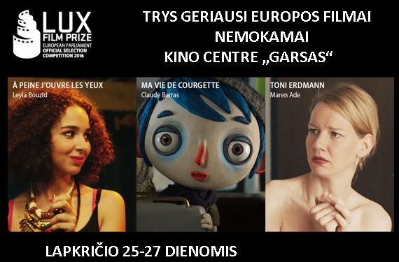 Primename, kad šiuos filmus galite pamatyti nemokamai lapkričio 25-27 dienomis. 25 d. 17:30 val. startuoja paauglių auditorijai skirtas filmas „Kai atmerkiu akis“, pasakojantis apie aštuoniolikametę tunisietę, kuri savo ir kitų merginų laisvę gina dainomis, nors už tai jai gresia dideli nemalonumai. 26 dieną 16 val. seansas, skirtas mažiesiems žiūrovams, jų lauks animacinis filmas „Mano kaip cukinijos gyvenimas“ apie meilę, gėrį ir nuoširdžią draugystę. Na, o lapkričio 27 dieną 16 val. išvysite LUX premijos laureatą, vokiečių filmą „Toni Erdmann“, nuskynusį beveik visus apdovanojimus visuose Europos kino festivaliuose. Retai pasitaikantis vokiškas humoras dramoje sukuria originalų siužetą, todėl prunkštelėsite ne kartą ir pačiose neįtikėčiausiose vietose. Nepraleiskite progos nemokamai pasimėgauti pačiais geriausiais Europos filmais