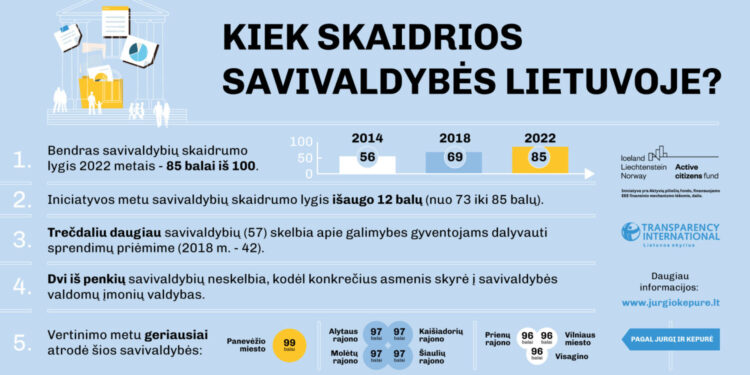 Savivaldybių interneto svetainių analizę TILS atliko 2022 m. spalio – 2023 m. sausio mėn. Vertinimo rezultatai buvo siunčiami visoms savivaldybėms, joms sudaryta galimybė pradėti viešinti trūkstamą informaciją ir taip pakoreguoti savo įvertinimą. Šia galimybe pasinaudojo 56 savivaldybės. Iniciatyvos metu bendras savivaldybių rezultatas pagerėjo 12 balų (nuo 73 iki 85).