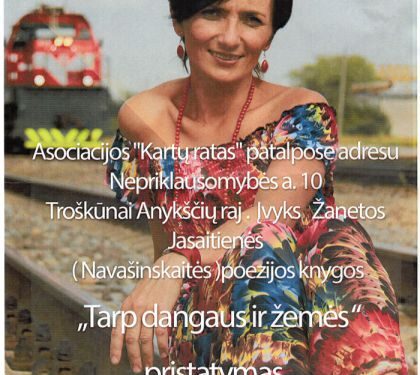Birželio 25 d. 18 val. Troškūnų multifunkciniame centre (Vilniaus g. 2a) Žaneta Navašinskaitė-Jasaitienė pristatys pirmąją savo poezijos knygą „Tarp dangaus ir žemės“. Pagrindinai dalykai, apie kuriuos savo eilėraščiuose rašo Žaneta – meilė ir gyvenimo prasmė, laikas ir vienatvė. Mylinčius poetinį žodį ir pažįstančius autorę, renginio organizatoriai kviečia ateiti į knygos pristatymą, nusiteikti atviram pokalbiui ir nuoširdžiam pabendravimui.