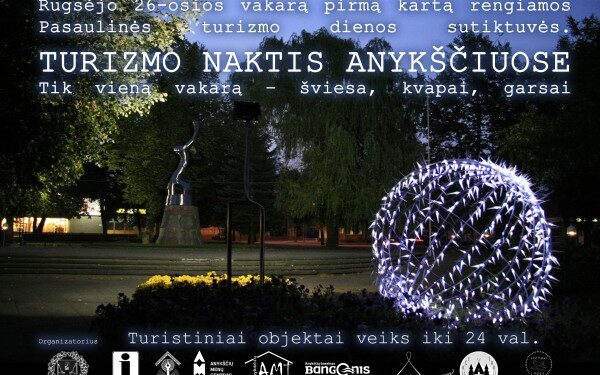 Rugsėjo 26-osios, šeštadienio, vakarą Anykščiuose pirmą kartą rengiamos Pasaulinės turizmo dienos sutiktuvės. Rudens sutemose atsiveriančios svarbiausios miesto kultūros erdvės nakties tamsoje vilios jas atrasti garsais, kvapais ar kitokiais potyriais.