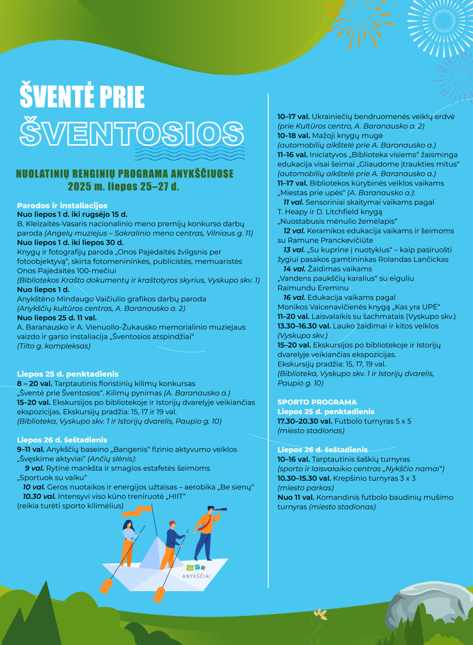 Liepos 25–27 dienomis į vieną gražiausių Lietuvos kampelių – Anykščius – sugrįžta tradicinė miesto šventė „Šventė prie Šventosios“. Tai ypatingas vasaros įvykis, kviečiantis gyventojus, kraštiečius ir miesto svečius trims dienoms pasinerti į meno, bendrystės ir gyvosios kultūros sūkurį.