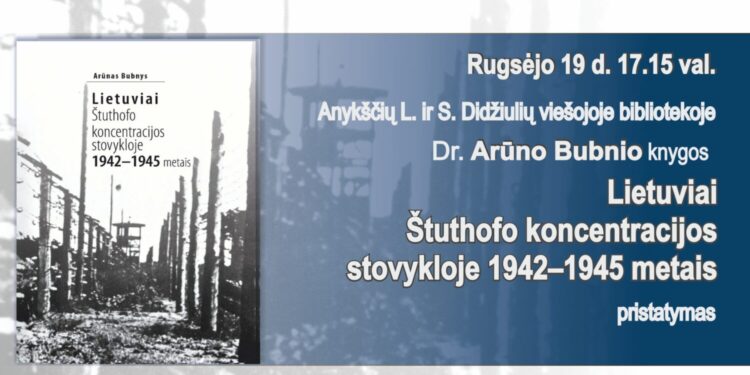 Rugsėjo 19 d. 17.15 val. Anykščių L. ir S. Didžiulių viešojoje bibliotekoje Lietuvos gyventojų genocido ir rezistencijos tyrimo centro generalinis direktorius, istorikas dr. Arūnas Bubnys pristatys naujausią savo knygą „Lietuviai Štuthofo koncentracijos stovykloje 1942–1945 metais“. Ši knyga pasakoja apie Lietuvos žmonių – politikų ir inteligentų, darbininkų ir ūkininkų – įkalinimą Štuthofo koncentracijos stovykloje, jų mirtis bei kančias. Apie Štuthofo mirties stovyklą pasaulyje publikuota nemažai knygų bei leidinių, tyrinėta šaltinių bei dokumentų, atlikta šios srities tyrimų. Ši lietuvių istoriko knyga – bene pirmoji, kurioje dokumentaliai ir išsamiai pateikiamos žinios apie Štuthofe kalėjusius ir žuvusius lietuvius.