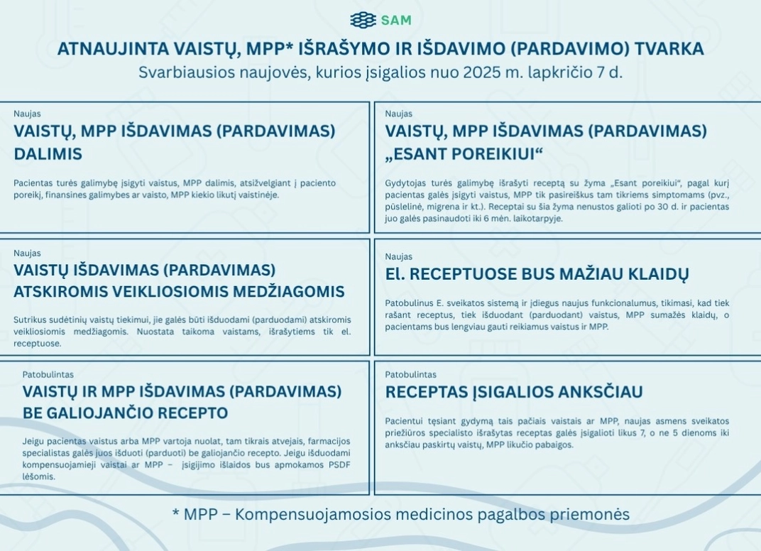 Sveikatos apsaugos ministerija (SAM) atnaujino receptų rašymo ir vaistų, kompensuojamųjų medicinos pagalbos priemonių (MPP) išdavimo (pardavimo) tvarką, kuri įsigalios lapkričio mėnesį ir bus paprastesnė bei patogesnė tiek pacientams, tiek asmens sveikatos priežiūros specialistams. Paankstintas recepto galiojimas, galimybė įsigyti vaistą arba kompensuojamąją MPP dalimis, be galiojančio recepto ir pagal poreikį bei kitos naujovės pagerins vaistų ir kompensuojamųjų MPP prieinamumą ir skatins racionalų vaistų išrašymą bei vartojimą.