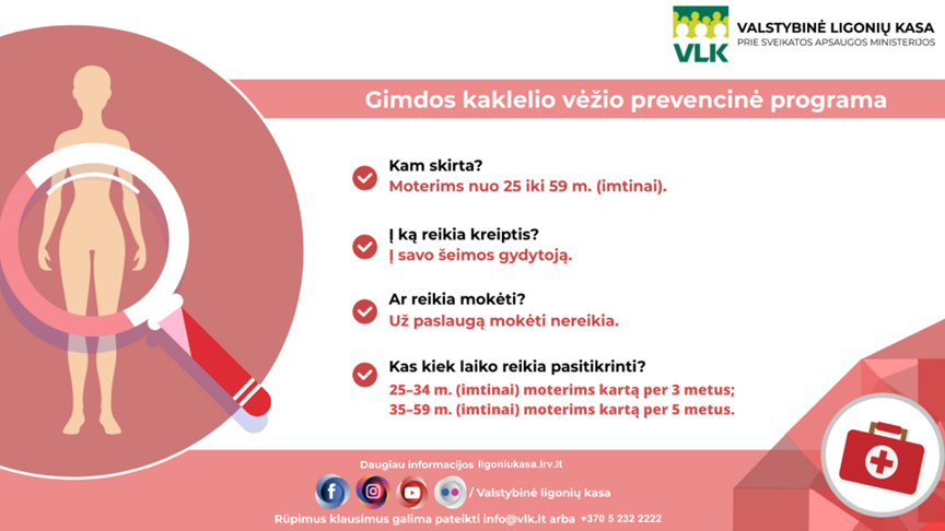 Gimdos kaklelio vėžio prevencinė programa skirta moterims nuo 25 iki 59 metų (imtinai). 25–34 m. (imtinai) moterims kartą per 3 metus, 35–59 m. (imtinai) moterims kartą per 5 metus.