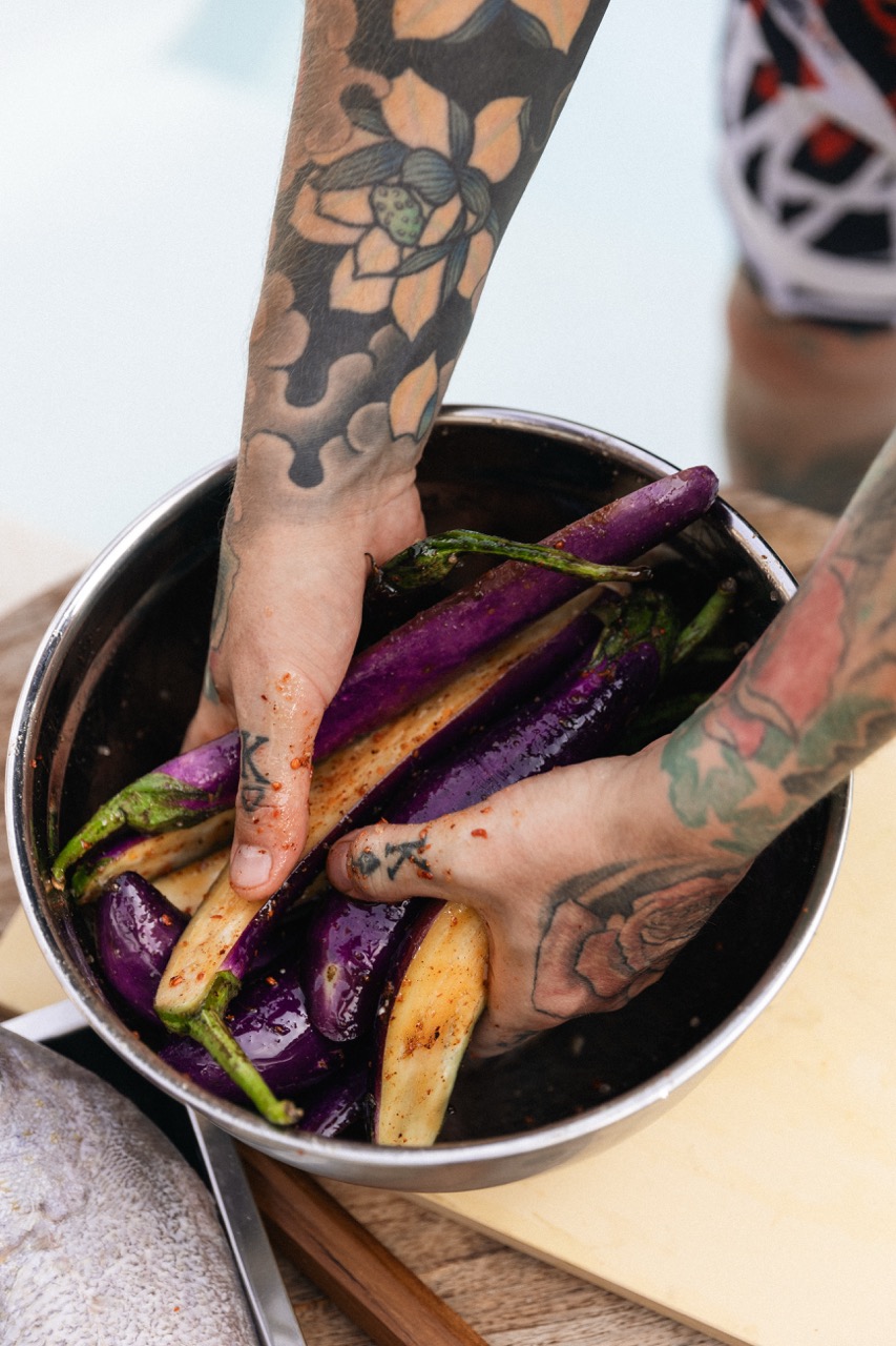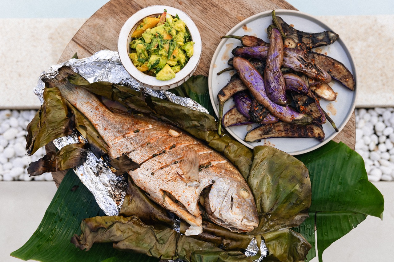5. Baklažanus kepu tiesiai ant grotelių, o žuvį suvynioju į foliją arba bananų lapus. Tokiu būdu žuvį lengviau apversti, ji skaniai iškepa ir išlieka sultinga.