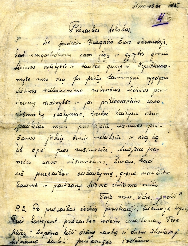 „Pamaldos baigėsi. Vyrai atliko išpažintį, priėmė Švenčiausiąjį. Atėjo iškilmingos priesaikos metas. Prie altoriaus ant pakopos buvo pastatyta taburetė, užtiesta trispalve. Ant jos – kryželis ir mano trumpasis ginklas. Dvasininkas pusbalsiu, bet aiškiai ir įspūdingai skaitė priesaikos tekstą. Iškėlę dešines, tyliai kartojome žodžius. Dievo akivaizdoje tvirtai pasižadėjome teisingai ir ryžtingai tęsti kovą prieš okupantą, kuris, pamynęs visus Dievo ir žmonių įstatymus, negailestingai naikina visa, kas šventa ir brangu. Pirmasis prisiartinau ir pabučiavau kryželį, trispalvę ir ginklą. Tą pat padarė visi vyrai. Po dvasininko prasmingo žodžio aktas baigėsi. Padėkojome ir netrukus vėl atsidūrėme Noškūnų miško prieglobstyje“, – rašė Adolfas Ramanauskas–Vanagas prisiminimų knygoje „Daugel krito sūnų“.
