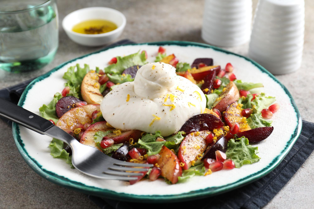 Reikės: 6 slyvų, 1 mocarelos, buratos rutuliuko arba ožkos sūrio ritinėlio, 2 nektarinų arba persikų, saujos mėgstamų salotų, graikinių riešutų, moliūgų sėklų, 2 šaukštelių alyvuogių aliejaus, ½ šaukštelio garstyčių, 1/2 šaukštelio medaus, ¾ šaukštelio citrinos sulčių, druskos, pipirų.