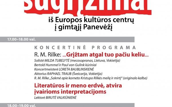 Taip pat išgirsime aktoriaus Raphael Traub (Šveicarija, Vokietija) originalo kalba skaitomą R. M. Rilkės tekstą „Die Weise von Liebe und Tod des Cornets Christoph Rilke“ („Sakmė apie korneto Kristupo Rilkės meilę ir mirtį“). Susijusį su R. M. Rilkės tekstu pranešimą „Literatūros ir meno erdvė, atvira įvairioms interpretacijoms“ skaitys Panevėžio V. Žemkalnio gimnazijos lietuvių ir lotynų kalbų mokytoja, Panevėžio miesto savivaldybės tarybos narė Birutė Valkiūnienė.