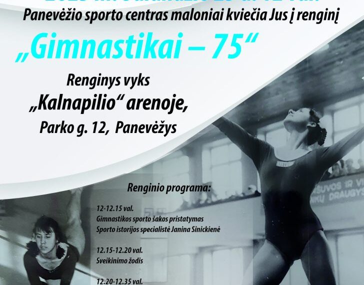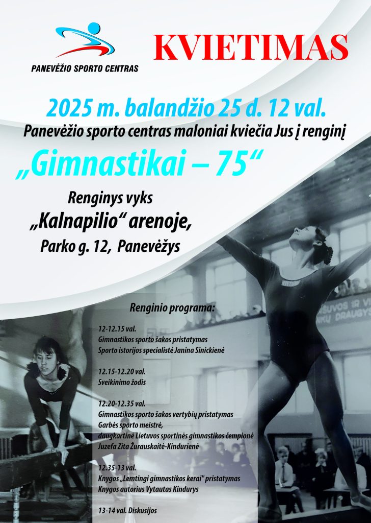 Šį penktadienį, balandžio 25 d., 12 val. „Kalnapilio“ arenoje sporto istorijos ekspozicijoje vyks renginys „Gimnastikai – 75“. Panevėžys turtingas sportinės gimnastikos istorija, kuri prasidėjo dar tarpukariu bei tęsiasi iki šių dienų. Minint gimnastikos 75-metį, kuomet Panevėžyje oficialiai buvo duotas startas šiai sporto šakai, renginyje dalyvaus legendinė gimnastė Juzefa Zita Žurauskaitė-Kindurienė, bus prisimintos gimnastikos sporto šakos vertybės, gimnastikos sporto šaką pristatys sporto istorijos specialistė Janina Sinickienė, vyks knygos „Lemtingi gimnastikos kerai“ apžvalga. Ją pristatytas pats knygos autorius Vytautas Kindurys.