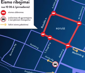 Laikinai eismo tvarka keisis tik transporto priemonėms. Vairuotojus pasitiks akligatvį nurodantys kelio ženklai: A. Jakšto, M. Valančiaus, Aleksoto ir Muitinės gatvėse.