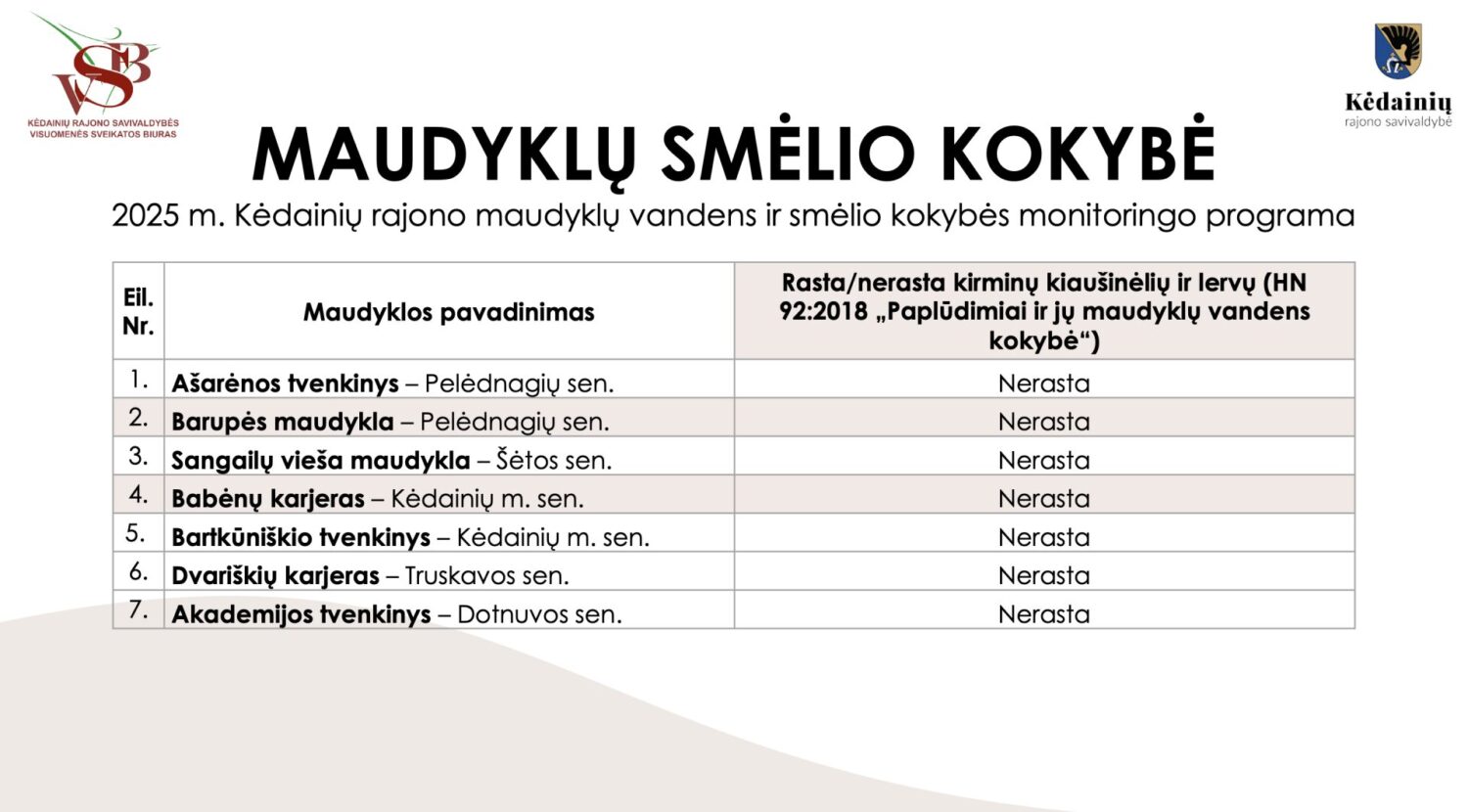 Vykdant, Maudyklų monitoringo programą Kėdainių rajone, sekantys vandens ir smėlio tyrimai bus atlikti 2025 m. birželio 2 d.