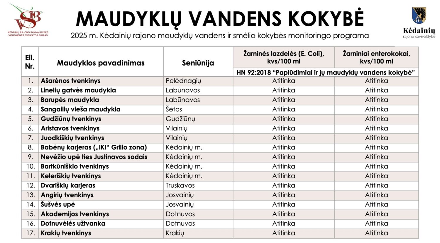 Kėdainių rajono savivaldybės visuomenės sveikatos biuras, bendradarbiaudamas su Nacionalinės visuomenės sveikatos priežiūros laboratorijos (NVSPL) Kauno skyriumi, 2025 m. gegužės 19 d. atliko Kėdainių rajono maudyklų vandens ir smėlio kokybės tyrimus. Vandens tyrimai atlikti 17-oje maudymosi vietų, smėlio – 7-iose. Maudyklų monitoringo programa finansuojama Kėdainių rajono savivaldybės Visuomenės sveikatos rėmimo specialiosios programos lėšomis.