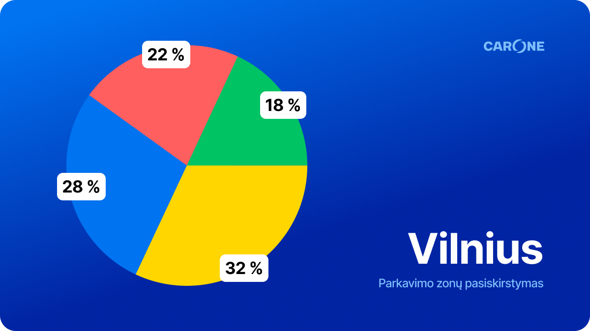 „carOne“ programėlės statistika rodo, jog vilniečiai automobilius dažniausiai stato pigesnio parkavimo zonose. 32 proc. visų mokamu parkavimu besinaudojančių vairuotojų savo automobilius palieka geltonoje rinkliavos zonoje. Pigiausioje, žalioje, zonoje automobilį stato 18 proc. vairuotojų, raudonoje – 22 proc., o brangiausioje – mėlynoje zonoje – 28 proc.