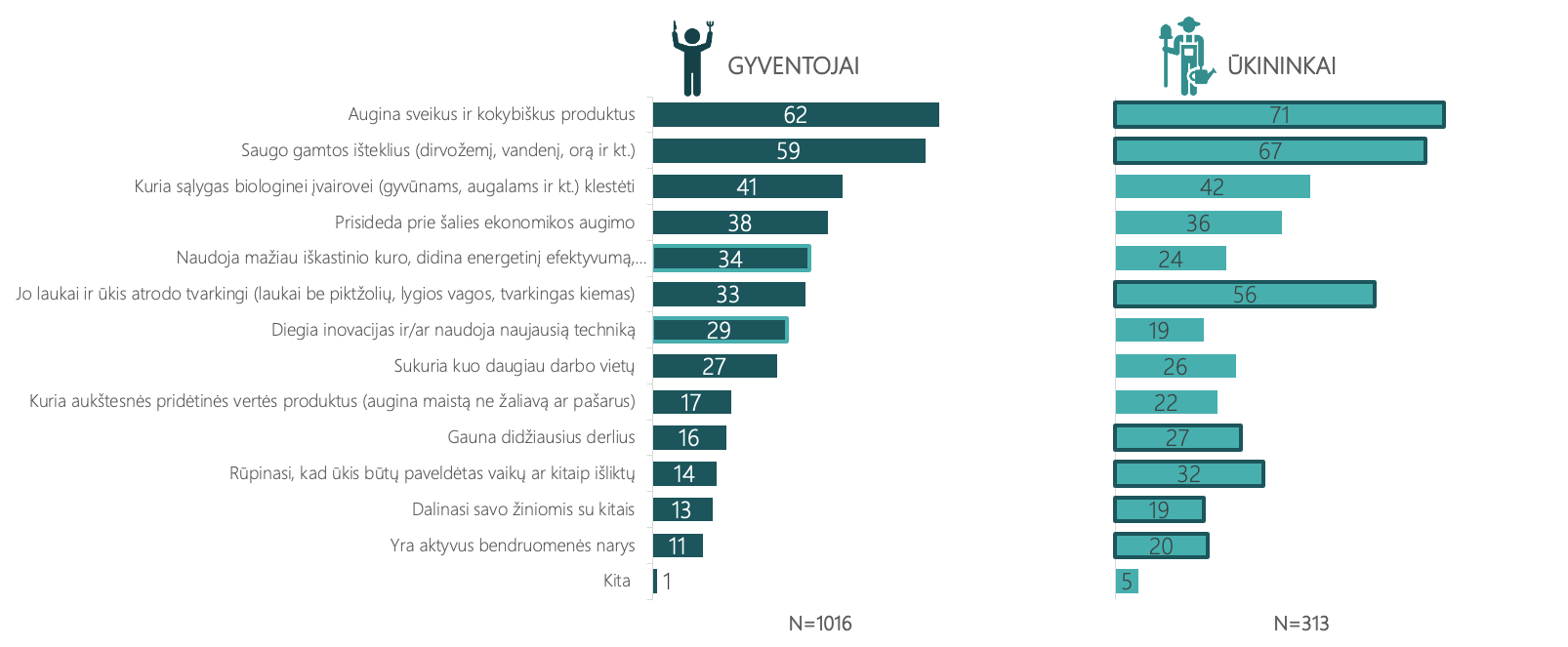 Panašų gero ūkininko įvaizdį turi ir visuomenė. Reprezentatyvi šalies gyventojų apklausa parodė, kad geras ūkininkas visuomenės akyse yra tas, kuris augina sveikus ir kokybiškus produktus (tai nurodo 62 proc. apklaustųjų), saugo gamtos išteklius (59 proc. apklaustųjų) bei kuria sąlygas biologinei įvairovei (41 proc.)