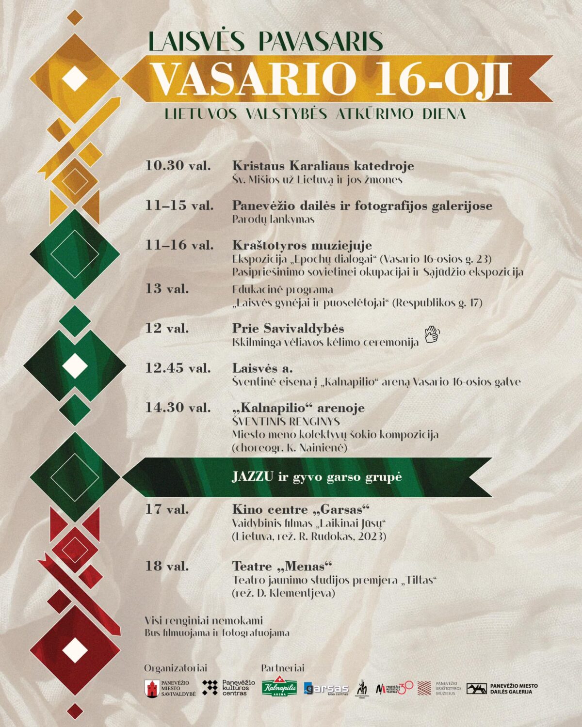 Visi renginiai – nemokami. Kviečiame panevėžiečius ir miesto svečius pasipuošti tautine atributika, atsivesti artimuosius ir švęsti laisvę drauge!