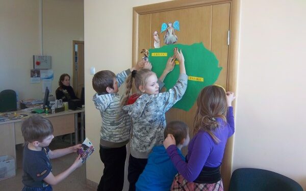 Šiandien mes kūrėme mūsų pasakiškos šalies koliažą: į Lietuvos kontūrus vaikai klijavo savo nupieštus ir iškirptus įvairių pasakų herojus.. Jei pakeliautume po šią Lietuvą, susitiktume su Raudonkepuraite, septyniais nykštukais, šiuolaikiniu kiškiu Striksiu, Buratinu, 2 keleiviais, pagranduku, vilku, Coliuke, Snieguole ir kitais veikėjais… Visi jie – iš mūsų perskaitytų pasakų.