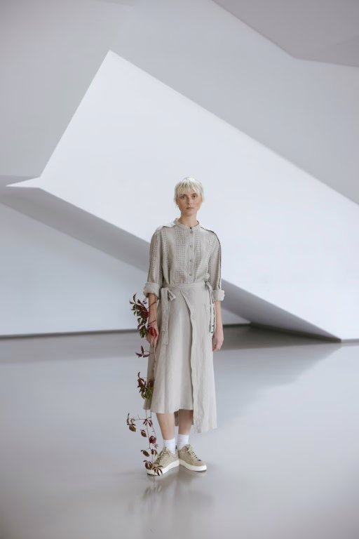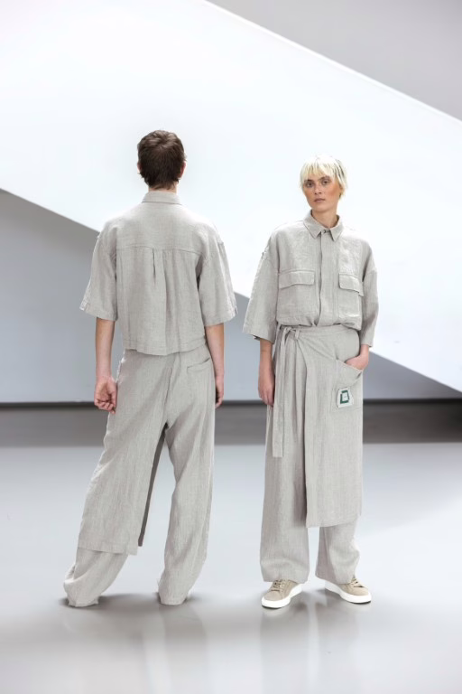 „Šūkis įkvėpė mane pasirinkti aprangos koncepciją ir audinį – natūralios spalvos liną, būdingą Baltijos regionui. Kolekciją sudaro aštuoni skirtingi lininiai drabužiai, kuriuos gidai gali derinti tarpusavyje priklausomai nuo oro ir nuotaikos. Tokia kapsulinė sistema leidžia kiekvienam darbuotojui atrodyti skirtingai ir kartu išlaikyti bendrą paviljono identitetą“, – pasakoja dizainerė.