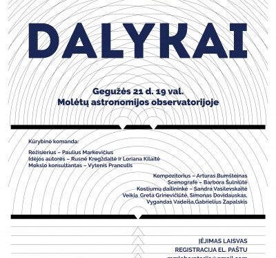 Gegužės 21 d. 19 val. Meno ir mokslo laboratorija kviečia atvykti į Molėtų astronomijos observatoriją, kur bus pristatytas mokslo ir meno atstovų eksperimento rezultatas – spektaklis „Dalykai“ (rež. Paulius Markevičius).