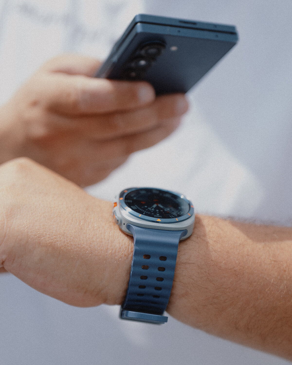 Galaxy Watch Ultra, fotografuojamas su Galaxy Fold7 sulenkiamu telefonu