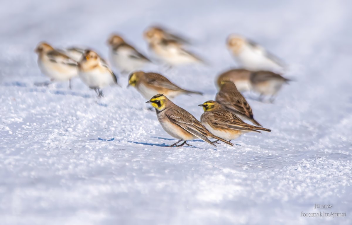 Ten pat žiemoja ir gausus sniegstartčių (Plectrophenax nivalis) būrys. Šie paukščiai taip pat gyvena šiauriniame pusrutulyje, aplink arktinę zoną, o žiemą migruoja į vidutinio klimato juostą. Lietuvoje jie dažni traukimo metu, kartais ir žiemoja. Paprastai laikosi atviruose plotuose, pakelėse. Jų gyvenamosios vietos plyti už poliarinio rato – Šiaurės Amerikos arktinėse tundrose, Islandijoje, Norvegijoje, šiaurės Grenlandijoje ir Sibire. Žiemą Lietuvoje jas galima sutikti laukuose, plynėse, prie kelių, kur yra nudžiūvusių augalų, taip pat arti ūkių, kur jos ieško pabirusių grūdų. Įdomu tai, kad jos dažnai nutupia ant elektros laidų.