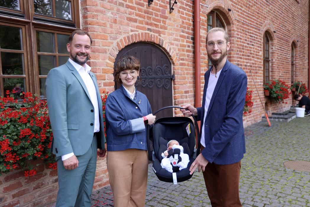 Pagausėjusią šeimą Raudondvario dvare pasveikino Kauno rajono savivaldybės vicemeras Laurynas Dilys. Jis tėvams įteikė kūdikio knygą, kurioje bus galima įamžinti svarbiausias sūnaus gyvenimo akimirkas, taip pat tradicinį kūdikio kraitelį. Šeimai buvo perduota ir Kauno rajono turizmo ir verslo informacijos centro dovana – nemokamas vienos valandos plaukimas laivu „Zapyškis“.