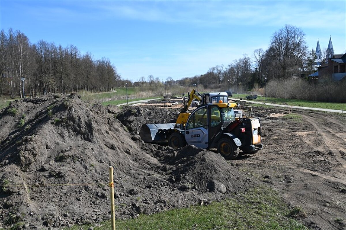 Prasidėjusius darbus apžiūrėti atvyko Pakruojo rajono savivaldybės vicemerė Simona Lipskytė bei savivaldybės administracijos direktorė Aušra Dvelienė. Šiuo metu parko saloje vyksta grunto kasimo, žaidimų aikštelės pagrindo paruošimo darbai, dedami bordiūrai bei ruošiamasi tolesniems aikštelės įrengimo etapams.