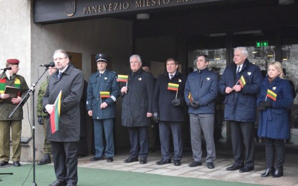 12 val. prie Savivaldybės iškilmingai kelta valstybės vėliava.