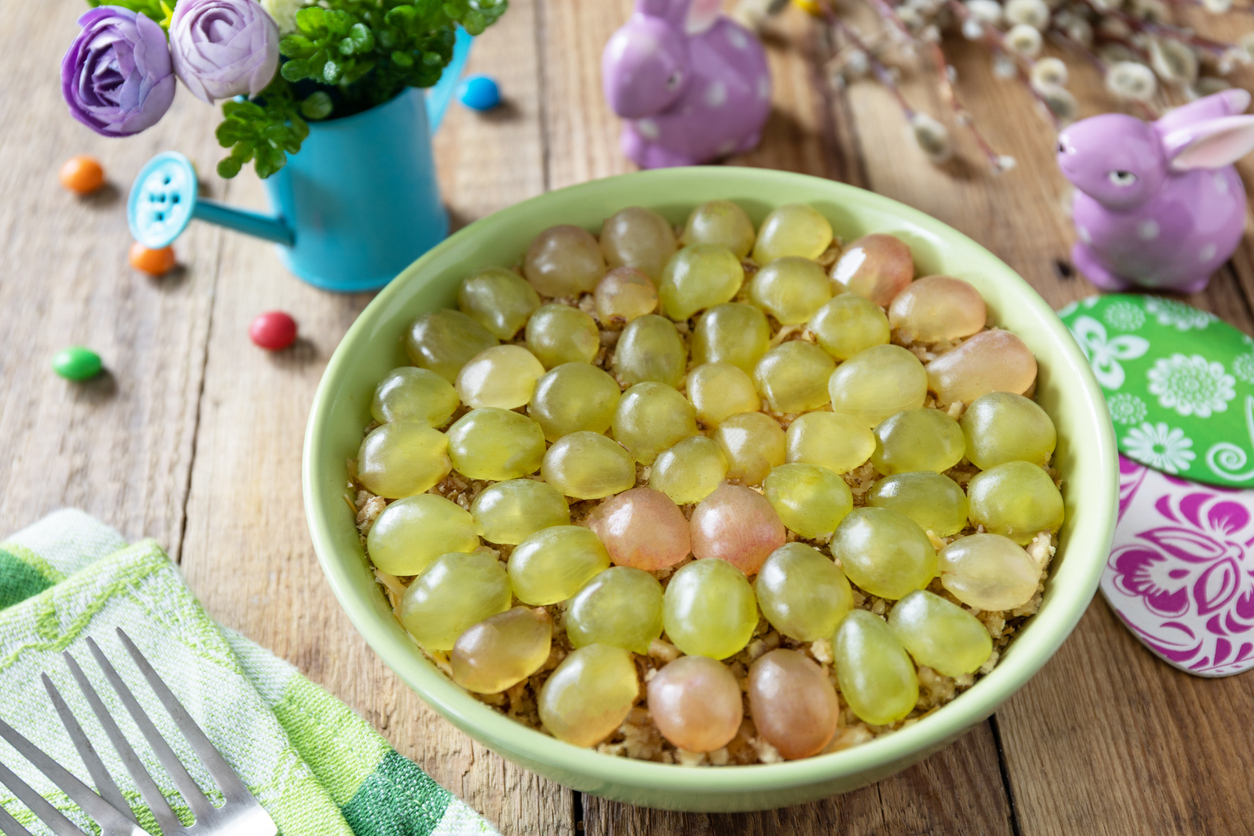 3. Likusias vynuoges perpjaukite per pusę ir jomis apdėliokite visą mišrainės viršų.