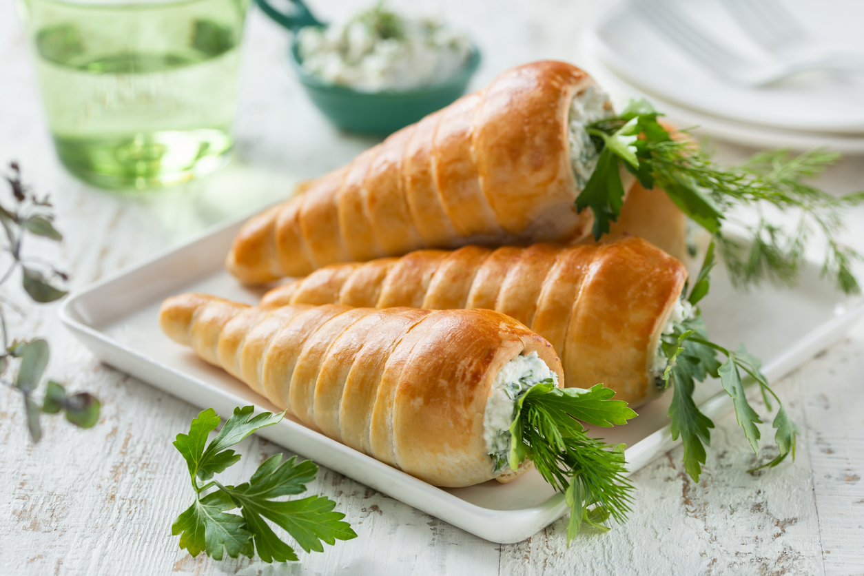 Šviežiu tepamu sūriu įdarytos „morkos“ iš tešlos