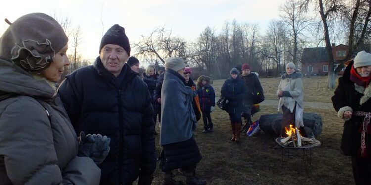 Kai Saulė nudažė dangų avietėmis, visa bendruomenė  įkopė į Čičinsko kalną, ir iškėlė inkilus, kad paukščiai greičiau parneštų pavasarį ant sparnų. Pakol vyrai su inkilais laipiojo po medžius, moterys paruošė vaišes. Seniai buvome nesimatę, todėl maloniai vaišinomės, bendravome. Niekas nenorėjo eiti namo. Vaidila Vėjas, kaip ir pernai, pakvietė mus aplankyti jo dvarelį, vadinamą „Vaiduoklių  namu“. Kaip ir pernai, ilgai nelaukę, sėdome į mašinas ir nuvažiavome į Ėriškius. Šeimininkas užkūrė židinį, supažindino svečius su  didžiuliu  žalčiu,  kuris saugo namus ir pakvietė mus „ant karštos arbatos“ Už stalo jis papasakojo, kaip susidraugavo su namo dvaselėmis, kurios turėjo madą  baladotis ir vaginėti nuo stalo indus… Vėjas papasakojo apie savo dvasinę praktiką – savo krikštą Žemaitijoje, senovinėje užmirštoje šventykloje, maudynes lediniame šaltinyje ir pagrindinį asmenybės virsmą, kuomet jis priėmė naują  lietuvišką  vardą ‒ VĖJAS. Sutarėme, kad vasarą visa bendruomenė aplankysime tą paslaptingą senovinę šventyklą. Raselė Palmilerė parodė pačios dailiai pasiūtą ir išsiuvinėtą Austėjos šventyklos vėliavą. Dar kalbėjome apie greitai lekianti laiką, apie didžiuosius virsmus ir nuotraukose matomus Dievų ženklus. Mūsų archyve taip pat yra  keletas   įspūdingų nuotraukų. Nepajutome, kaip atėjo naktis. Padėkoję „Vaiduoklių namui“ ir Vaidilai Vėjui iškeliavome į namus.