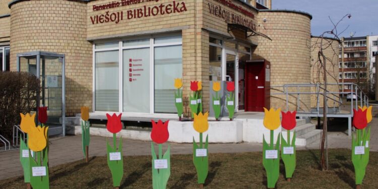 Priešais Viešąją biblioteką „Ąžuolo“ progimnazijos mokiniai kartu su mokytojais Daiva Bauboniene ir Romu Kupčinsku sukūrė spalvingą ir prasmingą instaliaciją: bibliotekos prieigos buvo papuoštos jų pačių pagamintais 35-iais Lietuvos trispalvės spalvų tulpių žiedais, simbolizuojančiais laisvę, vienybę ir tautiškumą. Ant tulpių kotelių sugulė lietuvių rašytojų ir pačių mokinių mintys, kurias rinko „Šaltinio“ progimnazijos moksleiviai, pavyzdžiui: „Laisvė tai – upė. Kiekvienas turi atrasti, kuria vaga jam reikia tekėti“ (Kotryna S.) ir kt. Rankų darbo dekoracijos suteikė bibliotekos aplinkai šventiškumo, iš toli traukė praeivių dėmesį ir priminė apie svarbią Lietuvai datą.