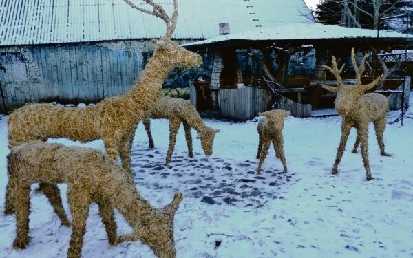 „Sumanėme padaryti elnių šeimyną su jaunikliais, jau visi užbaigti. Kiti metai pagal rytiečių kalendorių bus Gaidžio, tad pritiks, jei jis irgi kur nors netoli tvartelio bus įkurdintas. Iš pernykštės kompozicijos liko tvartelio fragmentas, ėdžios, šventoji šeimyna, šviestuvai, šiemet reikės kelių gyvų eglių, kad natūraliau atrodytų iš miško atėjusieji gyvūnai. Dar turiu suvynioti tris kiškučius, vyras daro skulptūrų karkasus, o aš vynioju, kiek tik šviesaus paros laiko ištaikydama. Turiu pernykščių vietos ūkininko Algirdo Notkaus šiaudų, dabar dar vieną ritinį iš kitos seniūnijos ūkininkai atvežė“, – pasakojo skulptūrų kūrėja.