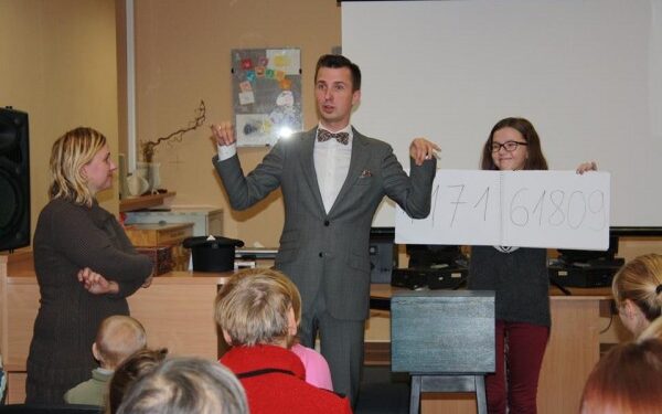 Vakaro siurprizu tapo nuotaikinga šou programa „Pasinerk į iliuziją“ su Justinu Malinausku. „Knyga padeda nusikelti mums į mistinį pasaulį, aš ir atlieku panašią funkciją“ – taip vakaro svečiams prisistatė jaunasis iliuzionistas. Nieko nelaukdamas jis įtraukė susirinkusius į veiksmą. Pasipylė triukai su nematoma kortų kalade, dalyvių telefonų PIN kodų spėjimu, raudona paslaptinga virve, kuri buvo mazgoma, kerpama, vėl rišama, iš dviejų galų atsirado keturi, virvė tai ilgėjo, tai trumpėjo… Kito numerio metu žiūrovai buvo klausiami įvairų skaičių – kiek knygų per metus perskaitė, namų adreso ar paskutinių telefono numerio skaičių, viską sudauginus rezultatas buvo netikėtas skaičius – renginio data ir net tikslus valandinis laikas! Paskutinis vakaro triukas – ant vienos kortos surašyti susirinkusių linkėjimai (naujų knygų, skaitytojų, europinių lėšų, laimėtų projektų, elektrinio židinio, katino ir kt.) bibliotekai, ant kitos – bibliotekos pavadinimas. Suspaudus abi kortas tarp delnų, staiga dvi kortos pavirto … viena!
