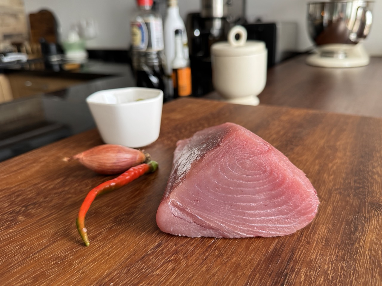 1. Tuną pjaustau 0,5–1 cm dydžio kubeliais ir stengiuosi jo nesusmulkinti. Dedu į dubenį, suberiu labai smulkiai pjaustytą šalotą. Įpilu sojos padažo, alyvuogių aliejaus, įdedu lašelį „Hoisin“ ir šiek tiek vasabio, pagardinu juodaisiais pipirais.