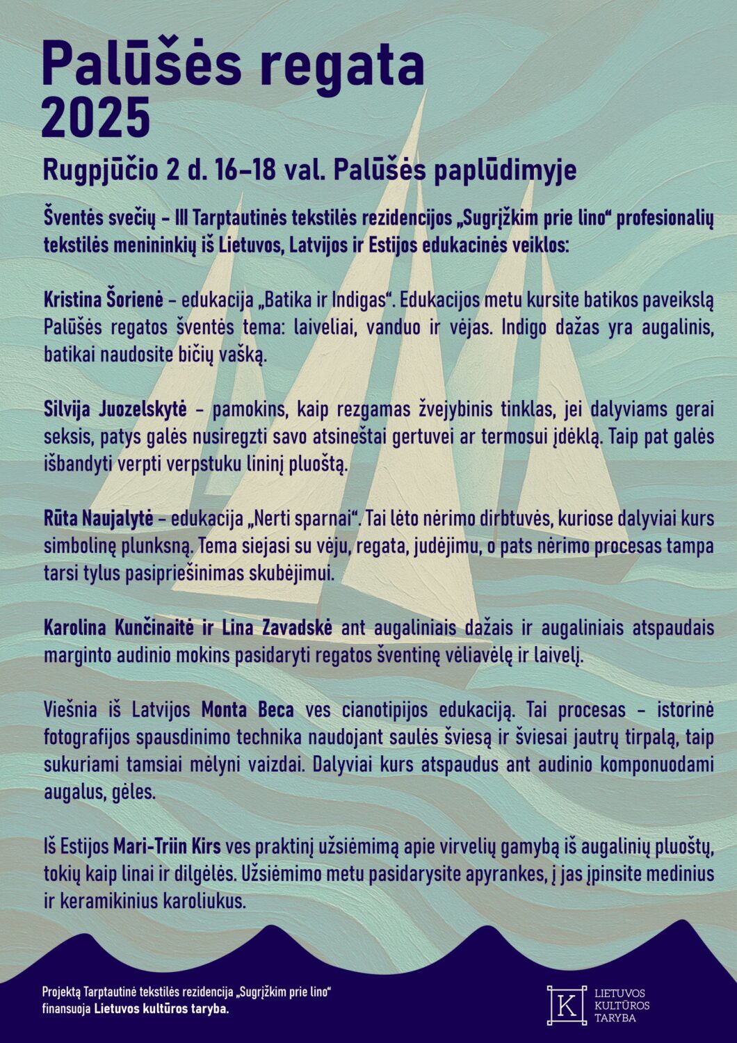 Rezidencijoje dalyvaujančios menininkės rugpjūčio 2 d., Palūšės regatos metu, nuo 16 val. iki 18 val. visuomenei siūlys šias kūrybines dirbtuves:
