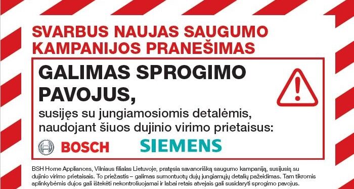 Prasidedėjo buities technikos gamintojo „Bosch“ saugos kampanija šio prekės ženklo ar „Siemens“ dujinių prietaisų savininkams. Turintys laisvai pastatomas dujines virykles, pagamintas 2006 – 2011 m., ar ant stalo pastatomus „Bosch“ dujinius paviršius, pagamintus 2004 – 2005 m., kviečiami patikrinti savo prietaisą specialiai šiai kampanijai sukurtoje interneto svetainėje www.gascookingsafety.com arba skambinant klientų aptarnavimo tarnybai (numeris Lietuvoje – 8 700 55595).