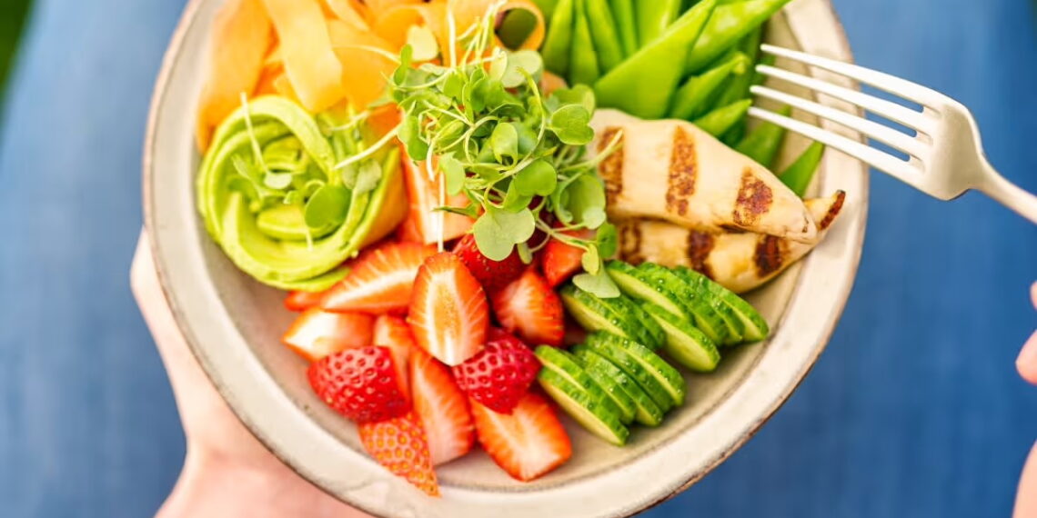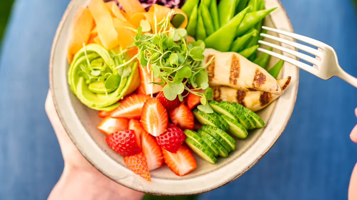 - Dubenyje išdėliokite paruoštas daržoves, braškes ir vištieną, užpilkite paruoštu padažu.