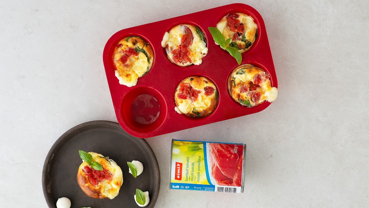 Omleto keksiukai su pomidorais, špinatais ir mocarela
