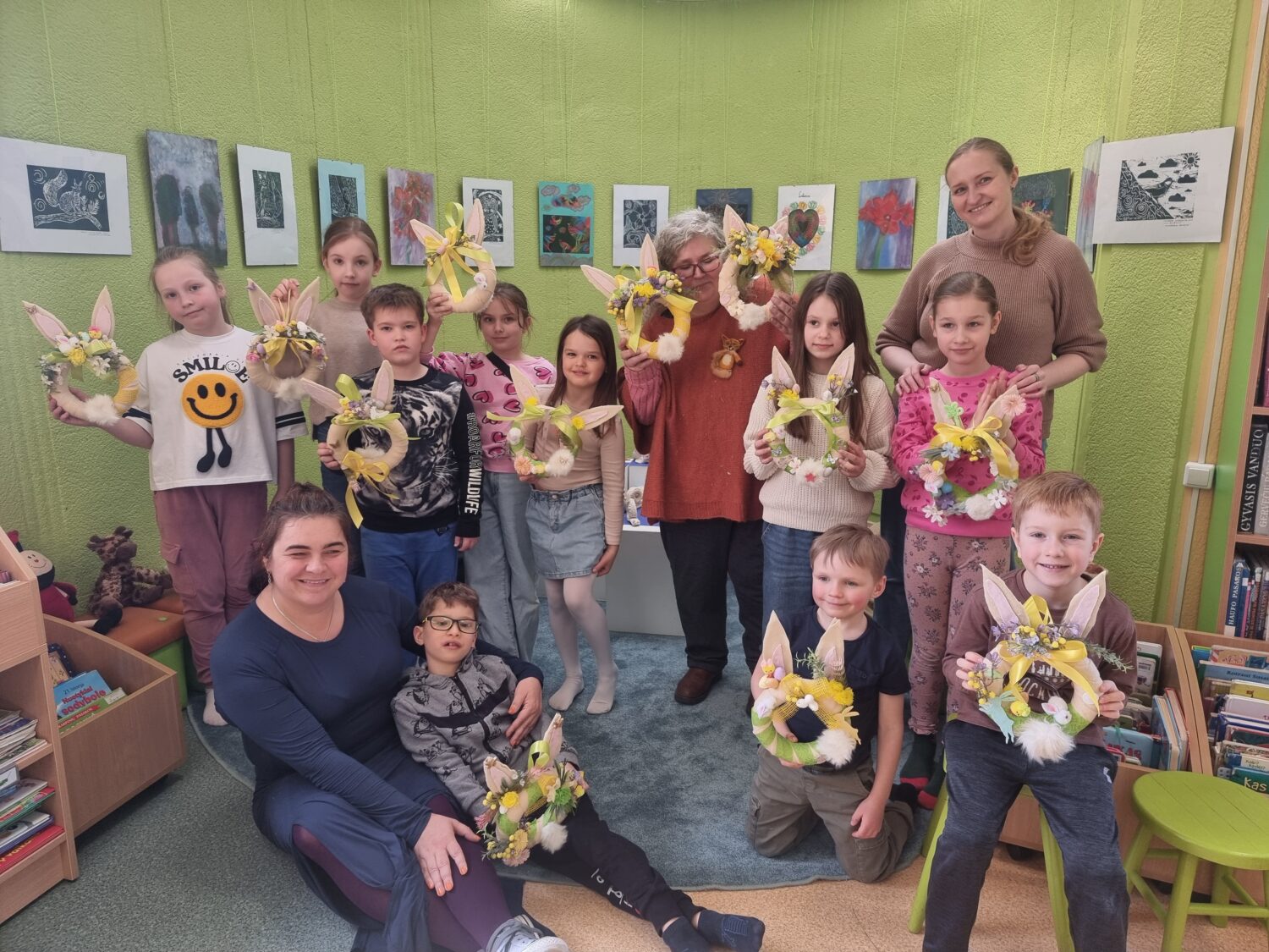 Balandžio 12 d. šeimos buvo kviečiamos į kūrybines dirbtuves su tautodailininke Dainora Guokiene Vaikų literatūros skyriuje „Žalioji pelėda“. Dalyviai, naudodami įvairias medžiagas ir dekoro priemones, gamino spalvingus velykinius vainikus ir atvirukus. Čia visą savaitę taip pat vyko velykiniai skaitymai ir žaidimai, kuriuose dalyvavę mažieji bibliotekos lankytojai turėjo progą pasinerti į kūrybingą atmosferą. Bibliotekos darbuotoja supažindino vaikus su Velykų tradicijomis, margučių spalvų reikšmėmis. Visi kartu skaitė ištraukas iš V.V. Landsbergio knygelės „Kiaušinių pasakos“, žaidė žaidimą „Karšta višta“ bei gamino šventinius atvirkus ir stalo dekoracijas.