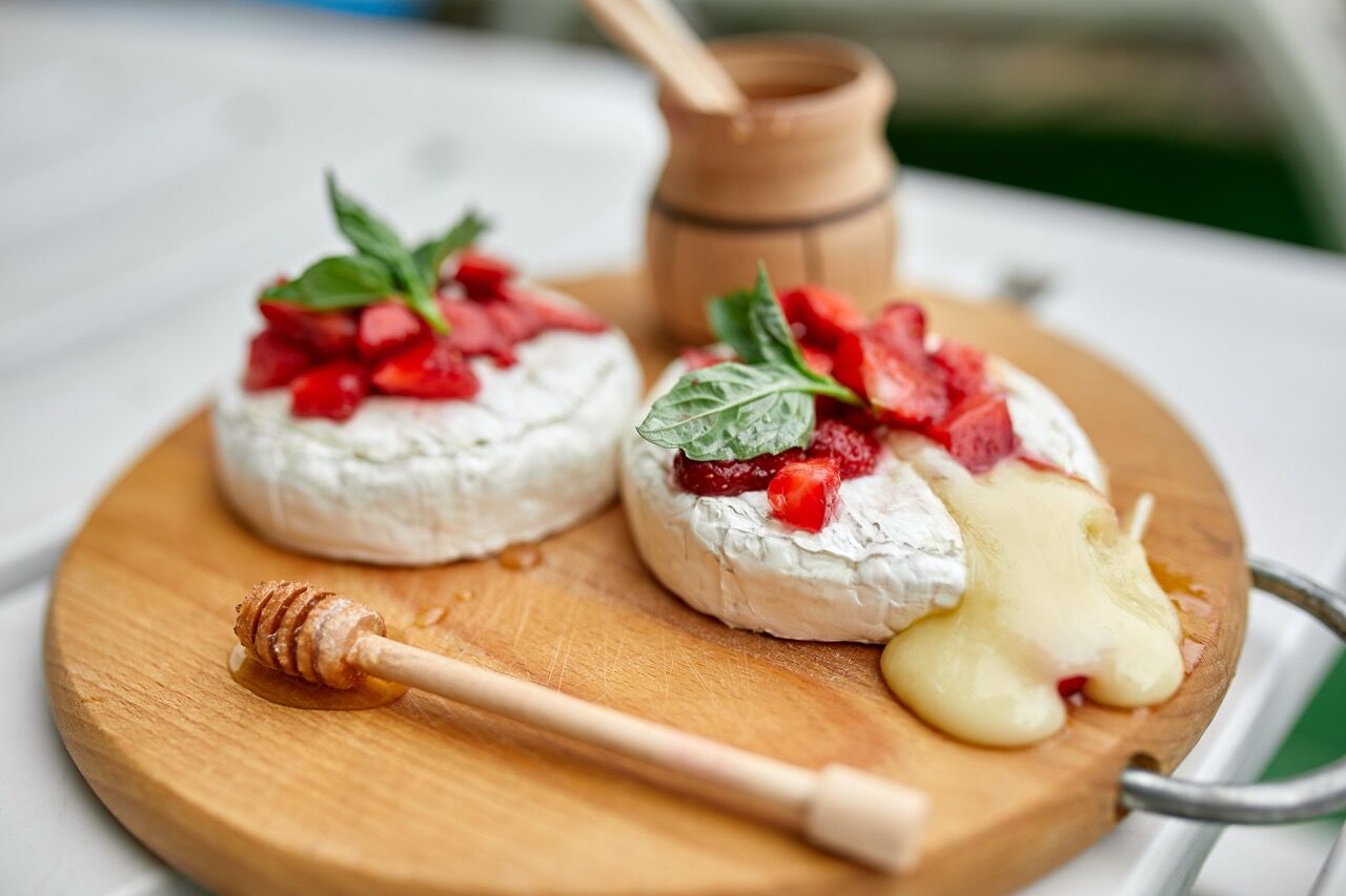 Vegetarams: grilintas bri arba kamambero sūris su šviežiomis braškėmis
