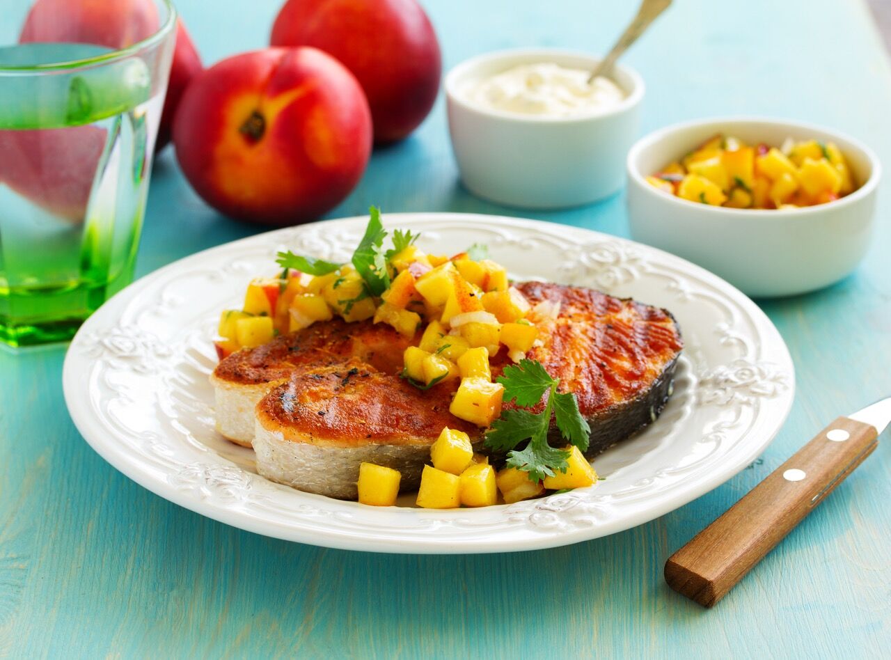 Žuvies gerbėjams: vasariška lašiša su persikais ir pomidorais